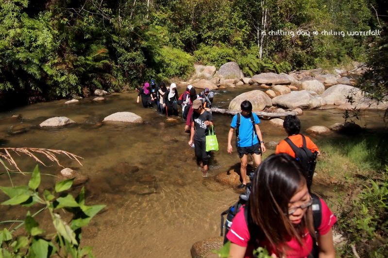 终于,我们到了第一条河咯。这是我们的第一个挑战。水,看起来不深。可是,里面好多鱼哦!而且,那些鱼都有我一个手掌的大小哦。我们竟然冒着踩到它们的危险,还有被鱼 "tiong" 的危险来过河!后来证明了,我其实真的是想太多了。第一,我根本都不可能踩到它们,因为我们人还没到,那些鱼儿早就四处乱走咯。第二,这里根本就不危险嘛。虽然石头会有一点点地滑,但是比起后面几条河,简直就是小巫见大巫。